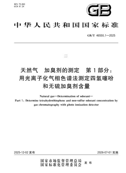 《GB/T 46550.1-2025 天然氣 加臭劑的測定 第1部分:用光離子化氣相色譜法測定四氫噻吩和無硫加臭劑含量》來源: